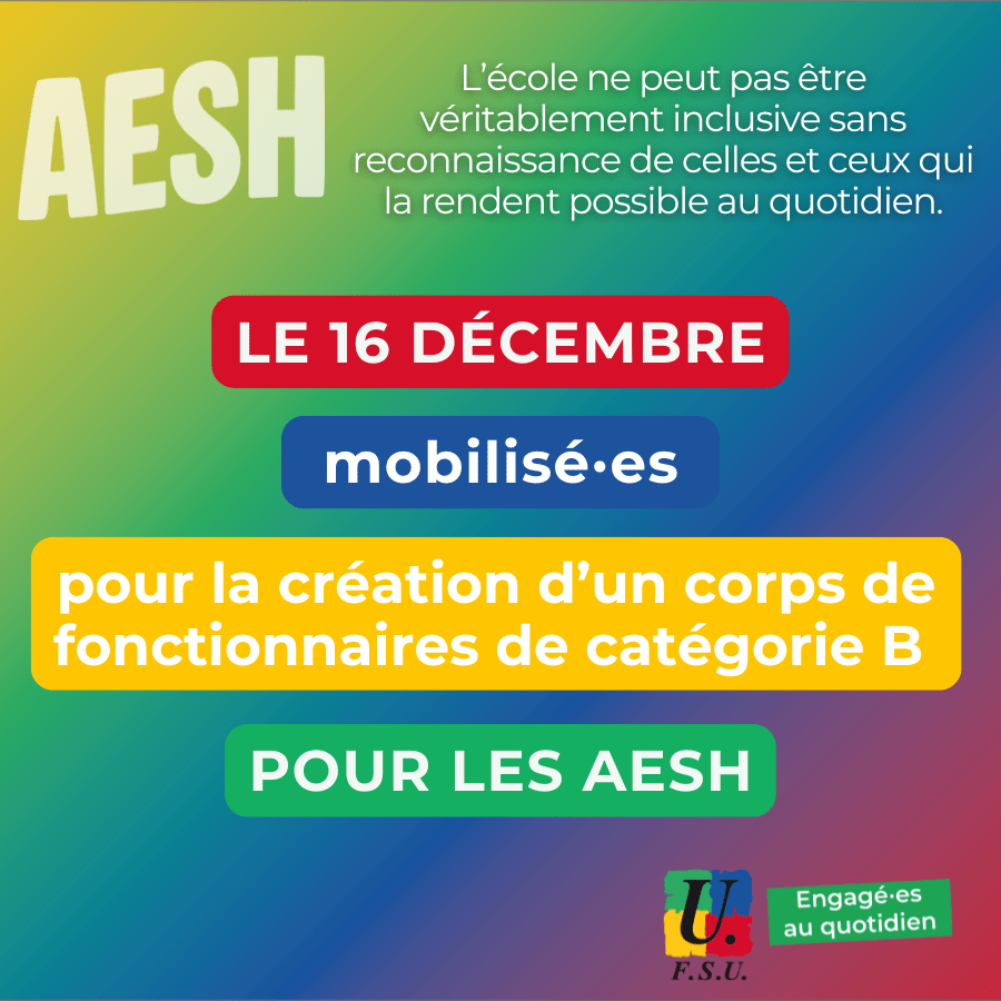 Journée nationale de mobilisation pour les droits des AESH, pour un vrai statut de catégorie B. Avignon : Rassemblement à 12h30 devant la DASEN. Bollène : Rassemblement à 12h15 devant l'Inspection (espace Curie)