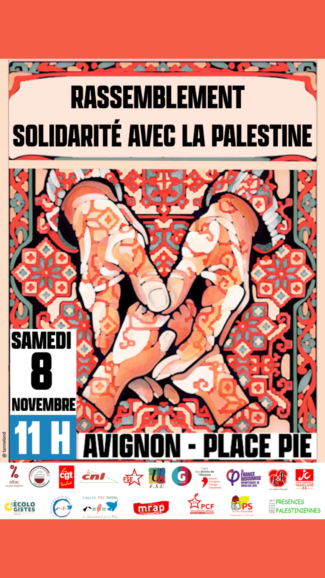 Manifestation à Avignon : 14h cours Jean Jaurès, le dimanche 21 septembre, journée internationale de la paix. Voir sur ce lien l'appel pour la reconnaissance de l'Etat palestinien et l'arrêt immédiat du génocide en cours.